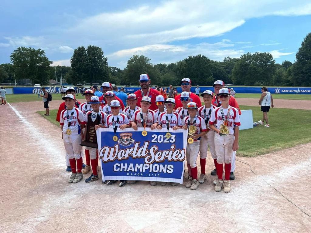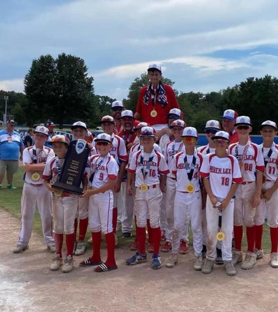 SOUTH LEXINGTON CAPTURES 11U CAL RIPKEN WORLD SERIES South Lexington’s 11u all-star team defeated last year’s 10u champions from Marlton, New Jersey in an exciting 3 to 2 victory in extra innings on Saturday in Ocala, Florida. Brady Tomazic got the scoring started for SL in the first inning. After singling to lead-off the game and advancing to third on a single by Jace Simmons, Tomazic scored from third on a pick-off attempt at first. SL added a run in the third inning. Houston Handshoe singled and stole second. Cooper Kearns drove him home with a two-out single. Grady Williams started on the mound for SL. He kept the New Jersey team scoreless until they scratched for a run in the 4th when they scored on a sacrifice fly. Earlier in the inning, right fielder Brady Kallop forced-out a runner at second on what appeared to be sure single that would have loaded the bases with no outs. SL went to the bottom of the 6th with a 2-1 lead. Williams was able to work out of a bases-loaded 1 out jam by coaxing a sacrifice fly to right that tied the game at 2, followed by pop-up to the mound to send the game to extra innings. In the top of the 8th, Handshoe and Simmons singled to put the pressure on Marlton. With no outs, the Marlton shortstop made a fantastic stop on a hard-hit ball by Kearns and turned a double play. However, the speedy Handshoe never slowed down after rounding third and scored the winning run just ahead of the throw to the plate from the first baseman. In the bottom of the 8th, with a 3-2 lead, Tomazic replaced Williams on the mound and needed just two pitches to induce a double play to record the save. Williams was awarded the star of the game in the championship game. He earned the win working 7 1/3 innings and allowed just 3 hits. The Cal Ripken World Series title is the fourth such title in South Lexington’s history which dates back to 1956.
